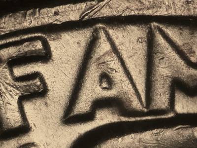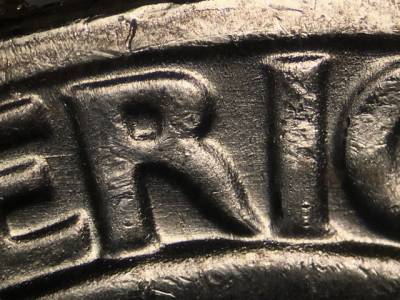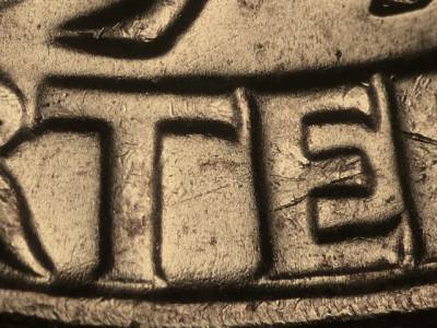 Reverse: Die gouge between the lower R in QUARTER and the D in DOLLAR. Two die gouges behind the eagles head.