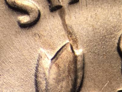 Reverse: Die pitting above the right side of the flames. Die pitting runs from the upper olive leaves to the T in STATES.