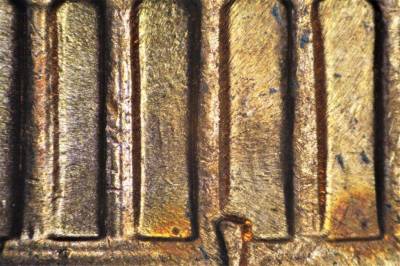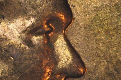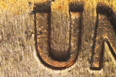 Obverse: Die scratches in front of eye. Small die gouge (dot) under nose. Small die gouge (dot) right of lower second T in TRUST. Roughly N to S and gently curving die scratches as well as multiple die gouges under RT in LIBERTY.