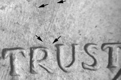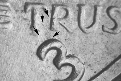 X-shaped and a N/S die scratch left of the eyelid. Large X-shaped die scratch connecting the RU of TRUST, which is positioned north of the letters. X-shaped die scratch connecting the TR of TRUST to the 3 in the date.