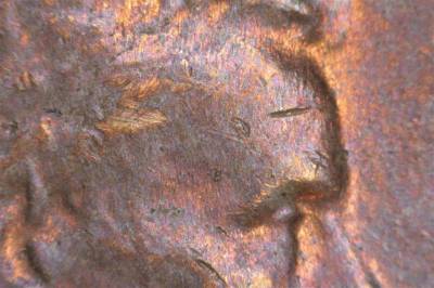 Stage A: Die crack south from jacket to rim. Multiple die gouges throughout the obverse, including prominently around LIBERTY and one on Lincoln’s temple.