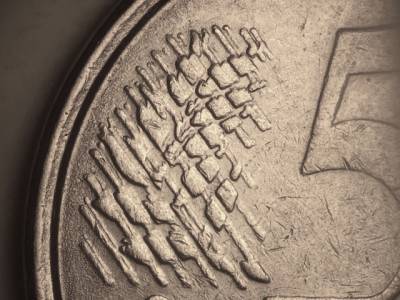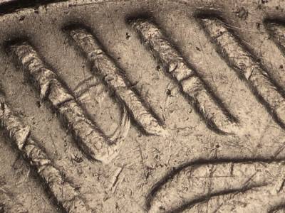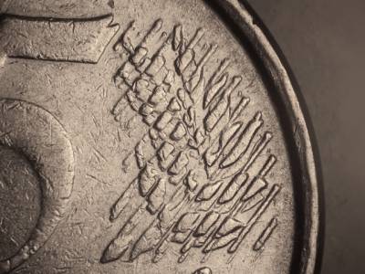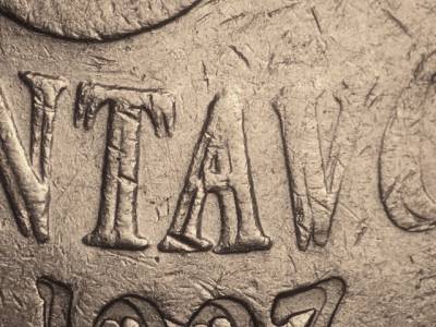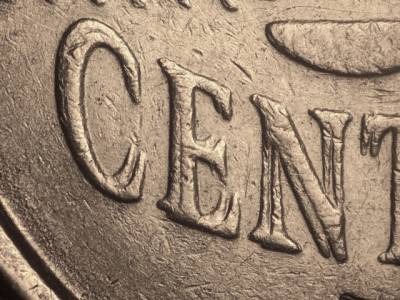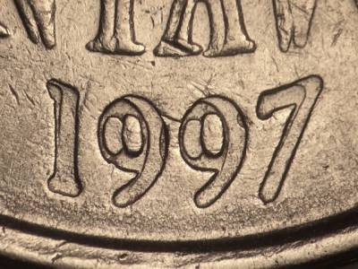 Extreme Class I spread on CENTAVOS, 1997, the top of the 5, and the laurel leaves.