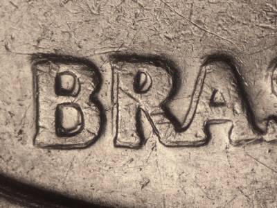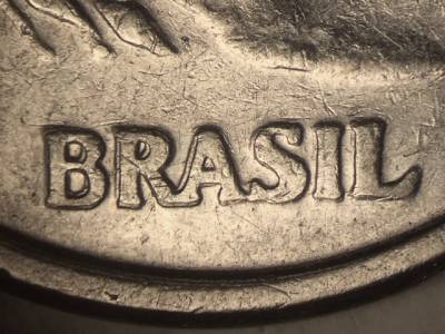Obverse: Obverse is SDDO-001, strong Class I spread on BRASIL and laurel leaves. Two light die clash marks in the diagonal lines at 12:00.