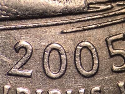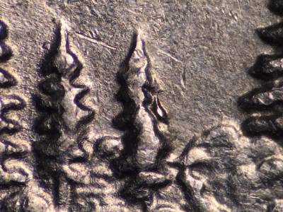 Reverse: Die crack through the top of 2005. Die crack extends NW from the top right of the state outline to the rim. Die crack curves NE from the right side of the grass strip. Die gouges to the left of the top of the two trees left of the target tree. Die gouge to the left of the seated fishermans knee.