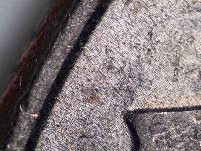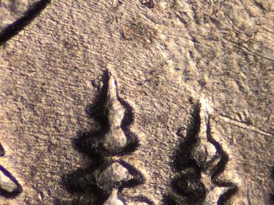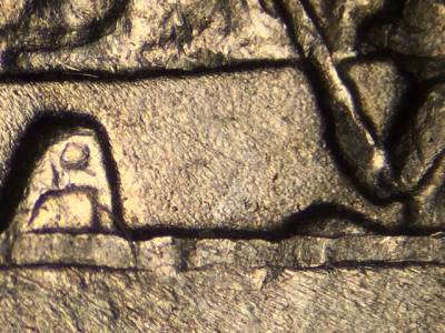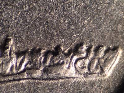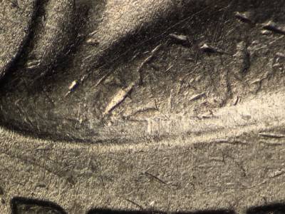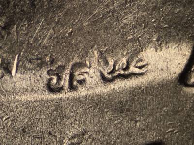 Obverse: Die chip on designers initials JF. Strong die crack on the base of the bust. Die gouge below the U in TRUST.