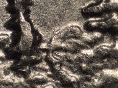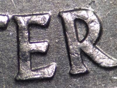 Obverse: Die crack through the designers initials JF and WC. Die gouge between the E and R in QUARTER. Die gouge to the right of the queue below the T in TRUST.