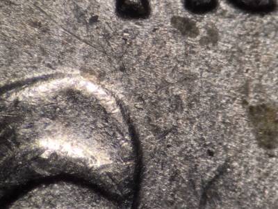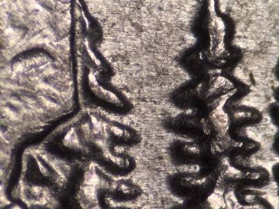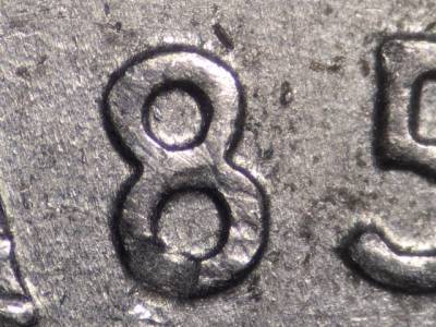 Reverse: Die gouges inside and to the right of the top of the first 8 in 1858. Die gouge between the third and fourth trees from the left.