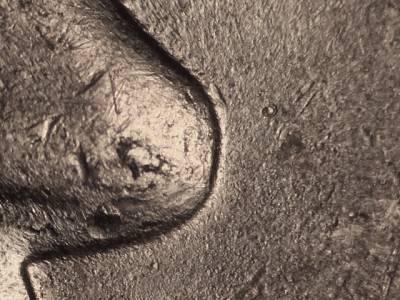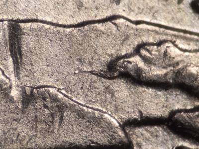 Obverse: Die crack and chips on the upper lip, the nose, and the E in LIBERTY. Die gouge in front of the tip of the nose.