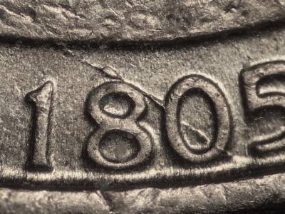 Reverse: Die crack runs from the area above the 1 in 1805, through the 0, and to the rim. Die crack runs west from the sixth branch of the largest tree. Die chip inside the W in the designers initials DW. Die cracks run north and south from the O in OCEAN.