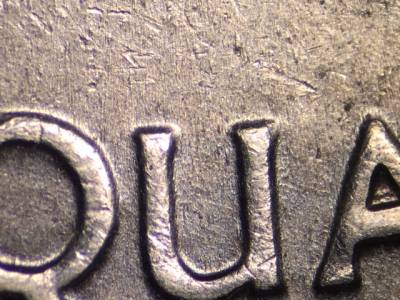 Obverse: Die gouge above the right side of the U in QUARTER. Die gouge between the tops of the E and D in UNITED.