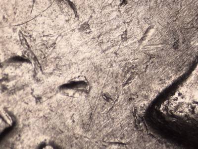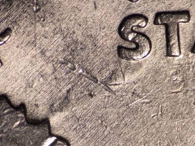 Obverse: Die clash remnants below the ear. SW-NE die scratch in front of the tip of the bust. Many die scratches above GOD.
