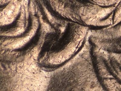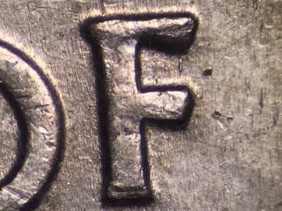 Obverse: Die gouge between the AR in DOLLAR and the queue. Die gouge inside the upper portion of the F in OF.