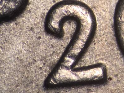 Reverse: Die chip inside the upper portion of the B in PLURIBUS. Die gouge between the right two sun rays. Die gouge left of the 2 in 2008.