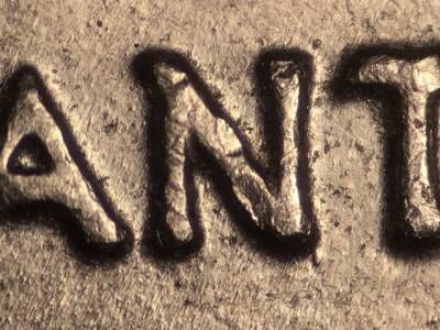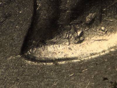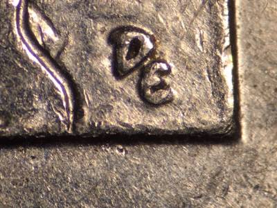 Reverse: Die gouge below the D in the designers initials DE. Die gouge between the O and F in OF. Die gouge touches the bottom right of the second N in ENCHANTMENT. Die gouge touches the lower right of the W in NEW.