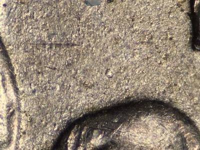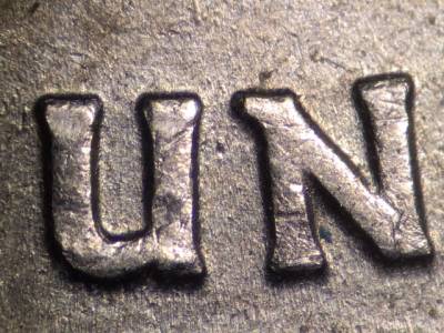 Obverse: Die crack through the designers initials JF and UC. Die gouge above the queue.