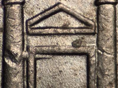 Reverse: Pre-die break depression on the upper right corner of the building. Die gouge above the left side of the E in CENTS. Die gouges above the LL in MONTICELLO. Die gouges above the right side of the building.