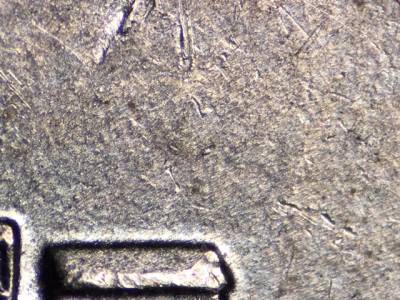 Obverse: Die chip on the right eyebrow. Die cracks and chips in the hair left of the ear. Die gouge above the W in WE.
