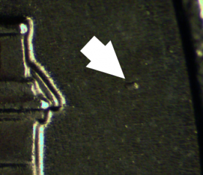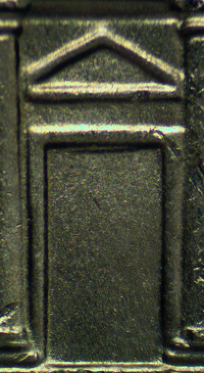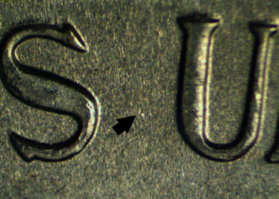 Reverse: Die gouge between the S in PLURIBUS and the first U in UNUM. Die gouge between the top right of the building and the rim.