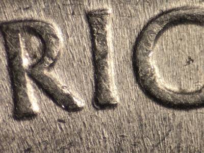 Obverse: Die gouge to the right of the A in STATES. Die gouge below the I in AMERICA.