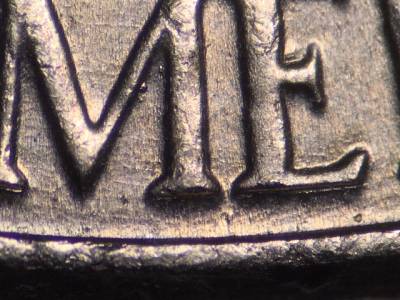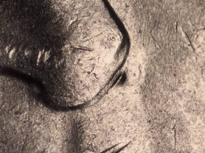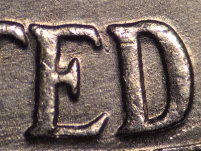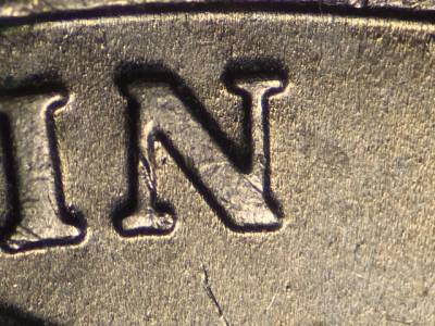 Obverse: Multiple die gouges in and below the N in IN. Die gouge just above the left side of the O in GOD. Die gouge to the left of the D in GOD. Curved die gouge above the Y in LIBERTY.