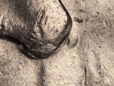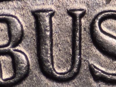 Obverse: Die gouge inside the D in GOD. Die gouge far to the right of the mintmark P.