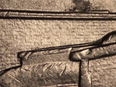 Reverse: Stage A: None known. Stage B: Die gouges below the right side of the flag.