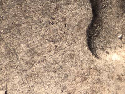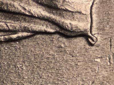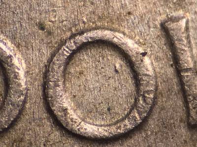 Obverse: Stage A: Die scratch runs SW from the chin. Stage B: Stage A die scratch extremely weak and may not be visible. Die gouge in and above the O in DOLLAR. Two die gouges on the nose.
