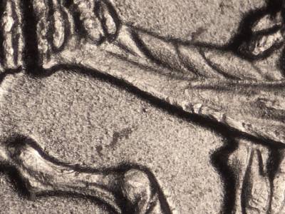 Reverse: Die gouge inside one of the openings in the branches to the left.