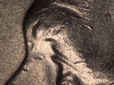 Obverse: Die chips on the back of the lips. Die chips on the eyebrow. Die gouge to the right of the R in LIBERTY.