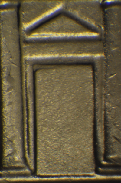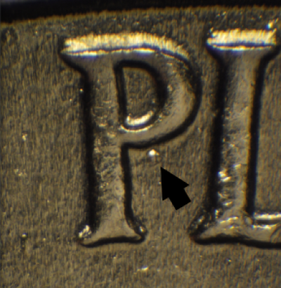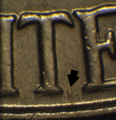 Reverse: Stage A: SW-NE die scratch on the building above the left arch. Stage B: Die gouge under the loop of the P in PLURIBUS. Die gouge between the lower T and E in UNITED. Die crack from right base of building to the rim.