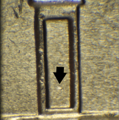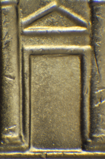Reverse: Stage A: Die gouge in the lower tall right window. Stage B: Stage A marker may be present, but Wexler does not mention it. Die gouge on the roof above and to the right of the tall right window. Die crack across the top of the dome.