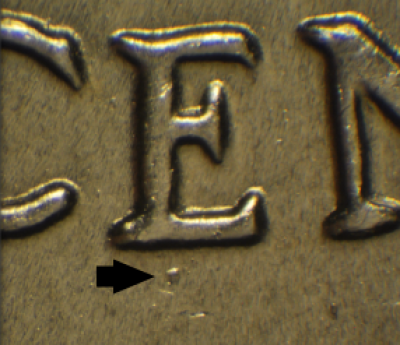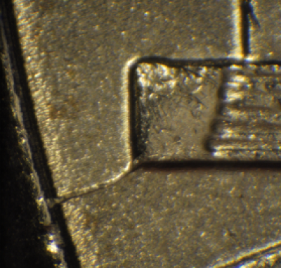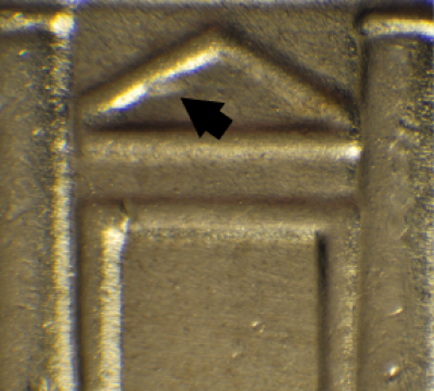 Reverse: Die gouge below the E in CENTS. Die gouge between the lower I and V in FIVE. Die crack from the left base of building to the rim.
