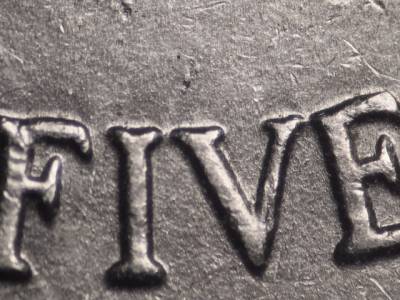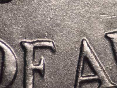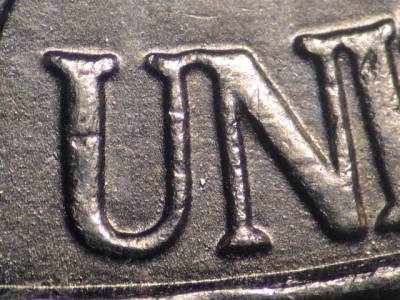 Reverse: Large die chip on the bottom of the N in CENTS. Die gouge between the U and N in UNITED. Die gouge above the left side of the V in FIVE. Die gouge above the F in OF. Die gouge to the left of the first A in AMERICA.