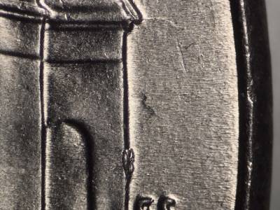 Reverse: A die crack, a die chip, and a pre-die break depression on the right side of the building. Die crack extends west from the top left of the building. Die crack in the left arch. Die crack runs through the tops of the TE in STATES. Die pitting in the field below the first U in PLURIBUS. Die gouge to the left of the tall right window.