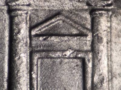 The upper left corner of the doorway is doubled to the northwest. Very similar to SDDR-031, compare doubling and die markers.