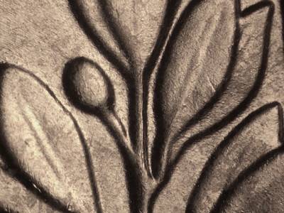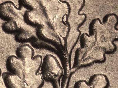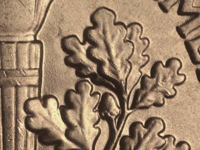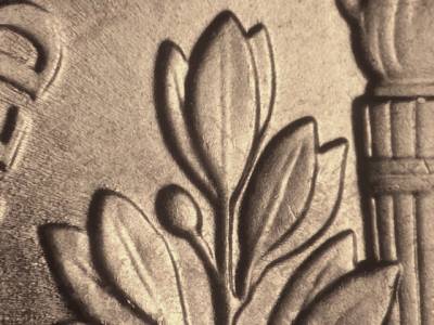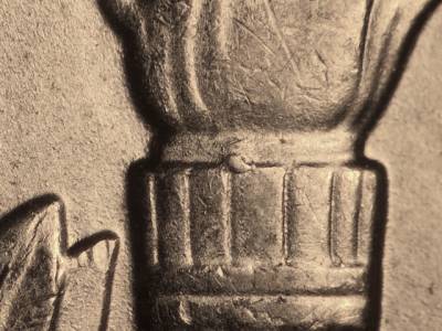 Reverse: Stage A: Many die cracks on the bottom of the torch. Die chip on the top of the torch. Many small die cracks and chips on the oak and olive branches. Die gouge touches the bottom of the olive stem. Stage B: All Stage A markers still visible. New die chip on the bottom of the torch. Most die cracks and chips increased in size.