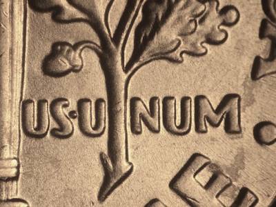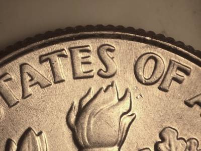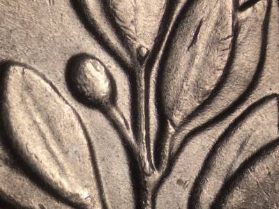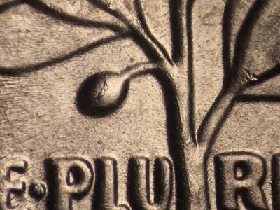 Strong extra thickness from E-W on E PLURIBUS UNUM, the torch, the branches, the leaves, and slightly on ONE DIME and USA.