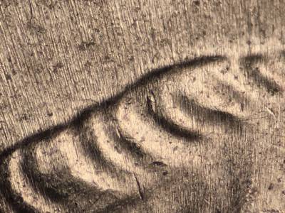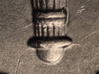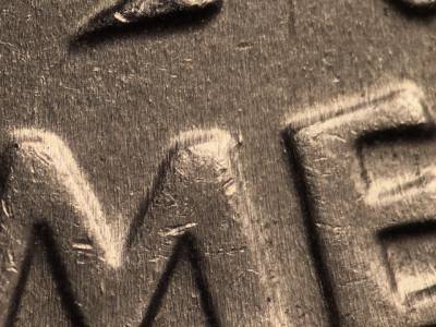 Obverse: Die chips on the nose, the cheek, the back of the lips, the eyebrow, the ear, and the hair above the ear. Die gouge above the right side of the U in TRUST. Die gouge in the very top of the hair. Die gouge to the left of the T in LIBERTY.