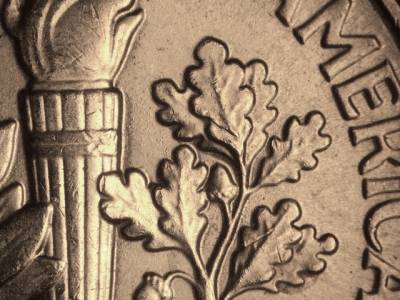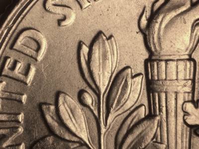 Reverse: Many die cracks and chips on the bottom of the torch. Die crack runs from the bottom of the oak branch to the M in DIME. Die cracks in the upper olive leaves. Die gouge to the right of the top of the M in DIME. Die gouge to the right of the F in OF.