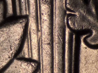 Reverse: Many die cracks on the bottom of the torch. Die scratch near the rim above the first S in STATES. Light die scratches through the upper olive leaves.