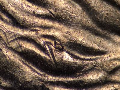 Obverse: Die chips on the back of the lips and the hair. Strong die gouge above the 2 in the date.