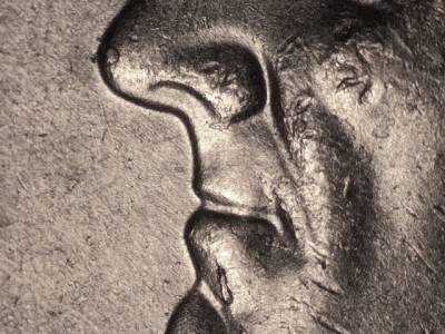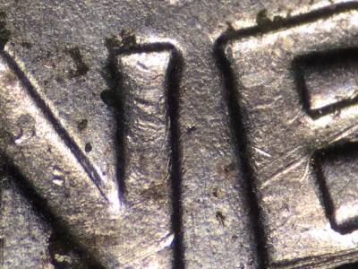 Obverse: Die chips on chin, the back of the lips, the nose, and the eyebrow. Die gouge inside the lower portion of the B in LIBERTY.