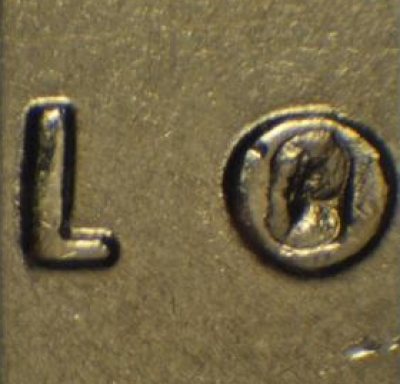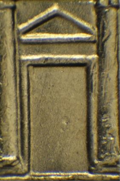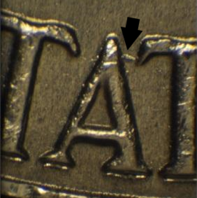 Reverse: Die gouge connects the top of the AT in STATES. Die break inside the second O in MONTICELLO.