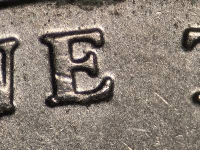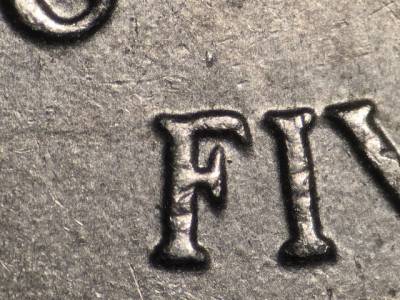 Reverse: Die gouge above the F in FIVE. Small die gouge below the right side of the E in CENTS.