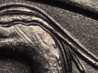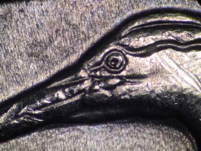 Reverse: Die chip under the eye of the great blue heron. Die chips on the back of the head of the great blue heron. Small die gouge below the fourth grass strip.