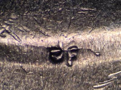Obverse: Die crack runs across the designers initials JF with a die chip on the J and a smaller die chip to the right of the initials. Die gouge above the U in QUARTER.