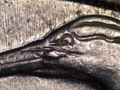Reverse: Stage A: Die chip below the eye of the great blue heron. Stage B: Same as Stage A.