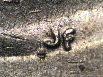 Obverse: Large die gouge just below and to the left of the J in the designers initials JF.