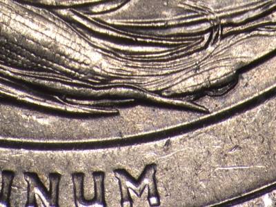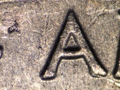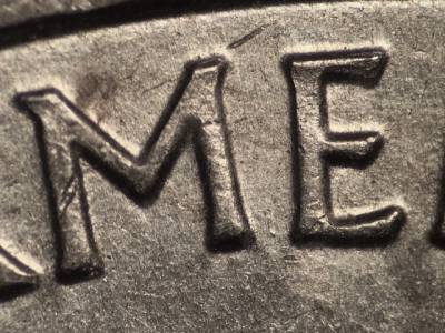 Obverse: Stage A: Die gouge between the bottoms of the M and E in AMERICA. Stage B: Stage A marker still present. Die gouge between the T and E in STATES. Die gouge to the left of the first A in AMERICA. Die gouge above the right side of the U in QUARTER.