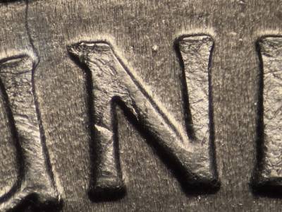 Obverse: Die gouge in the Q in QUARTER. Die gouge inside the upper N in UNITED.